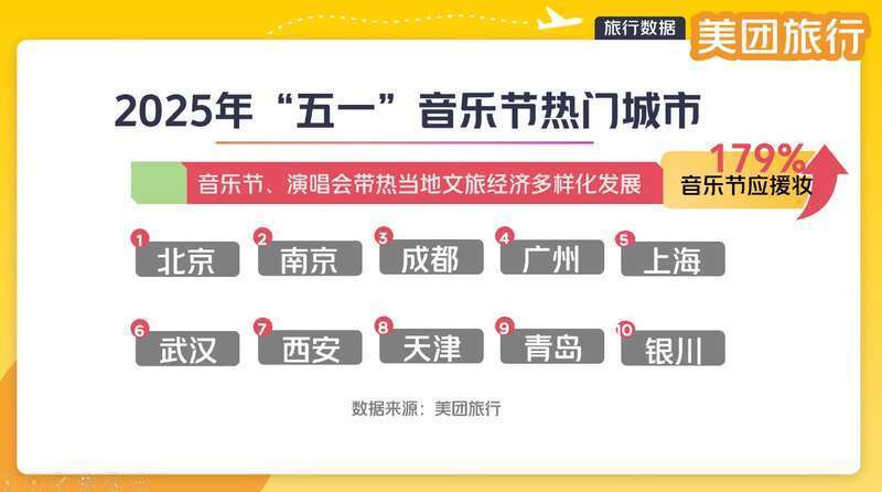 同期,“五一”音乐节Top10的热点城市为:北京、南京、成齐、广州、上海、武汉、西安、天津、青岛、银川。此外,受演唱会、音乐节带动,宝鸡、常州、滁州、孝感、阜阳、伊宁成为热点小城。